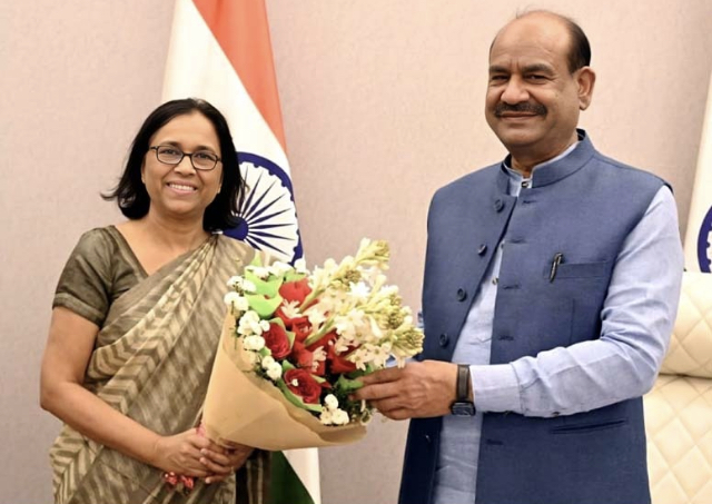 लोकसभा अध्यक्ष ओम बिड़ला से सी.एम.एस. प्रबन्धक प्रो. गीता गाँधी ने की मुलाकात